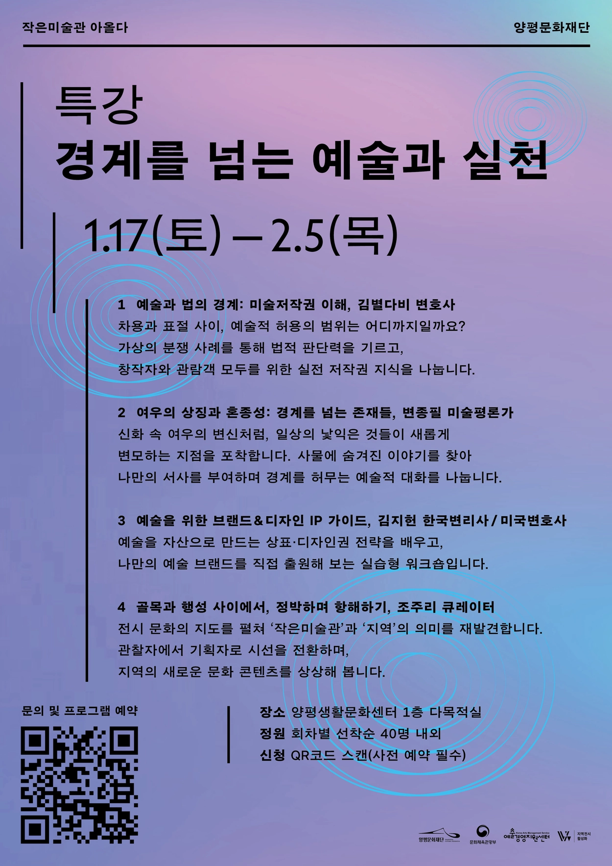 작은미술관 기획전시 <여우 나오는 꿈>과 연계하여, 미술 저작권에 대한 이해를 비롯해 브랜드·디자인 IP 가이드, 평론 및 전시 기획을 주제로 한 특강 프로그램을 운영합니다.