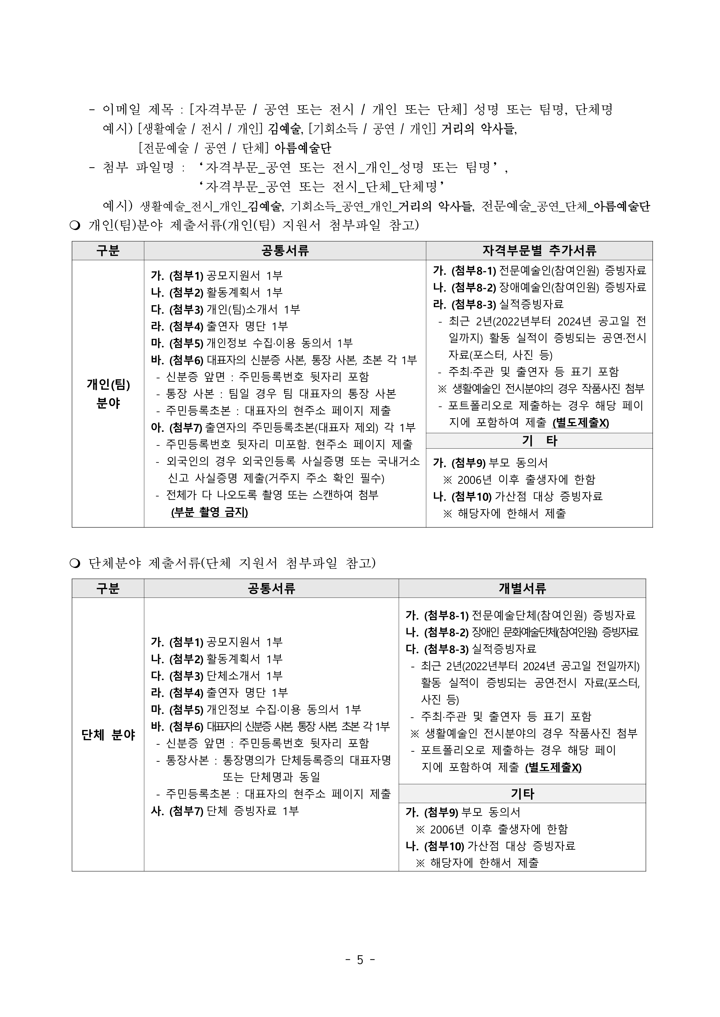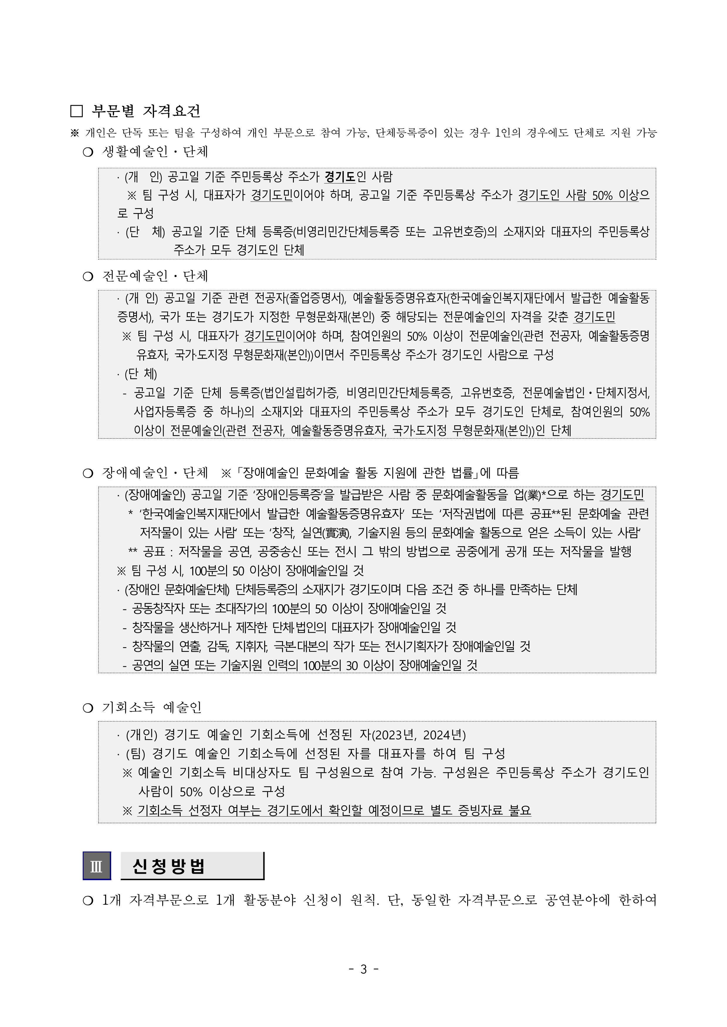 ○ 자격부문 : 생활예술인(단체), 전문예술인(단체), 장애예술인(단체), 기회소득예술인