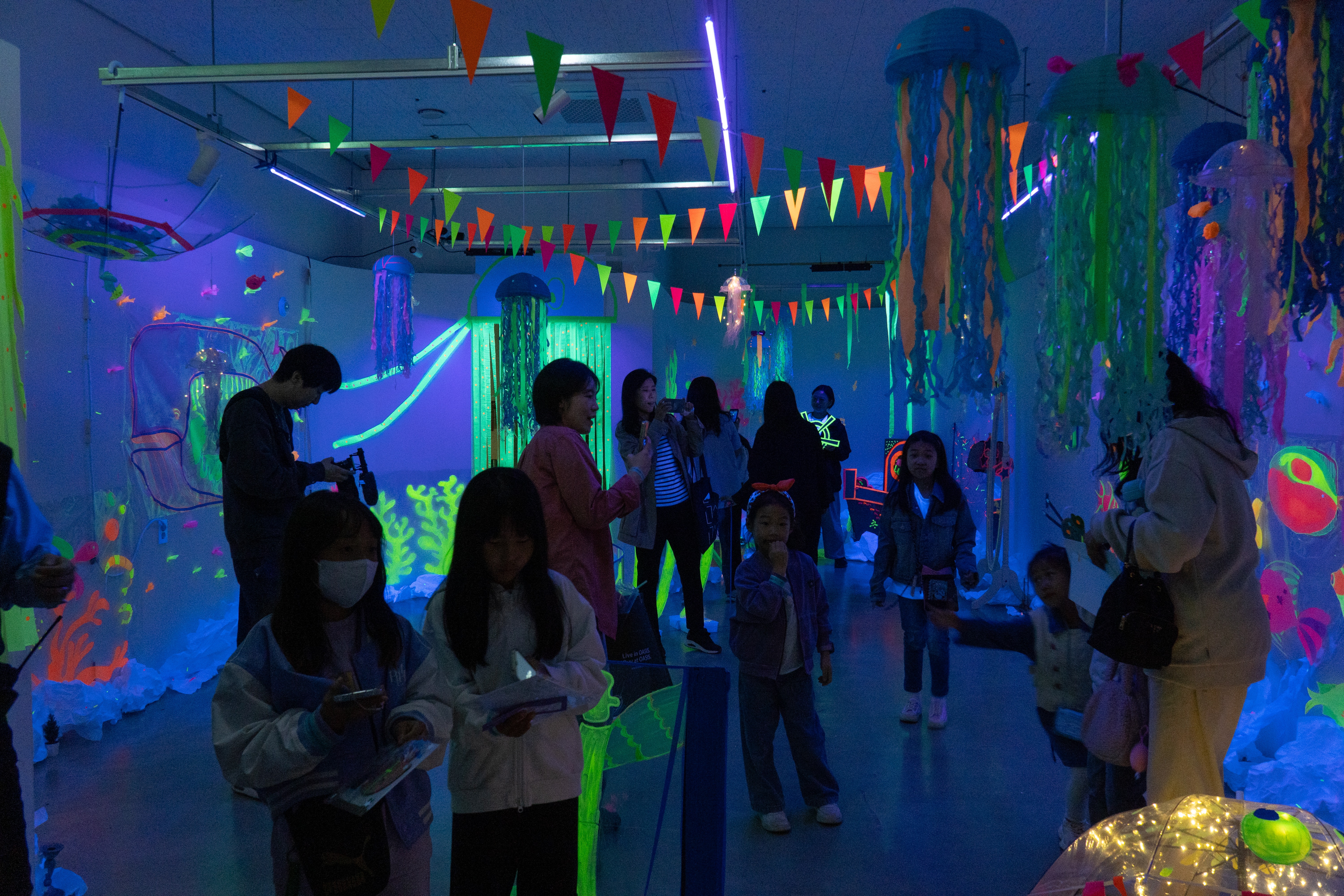 지하 1층 스튜디오 양평 | 고래 뱃속 탐험, 블랙 라이트 하우스 | 내가 만든 아기 해파리와 블랙 라이트 하우스로 이동하여, 발광하는 고래 뱃속을 구현한 지하 공간을 탐험해 보자. |