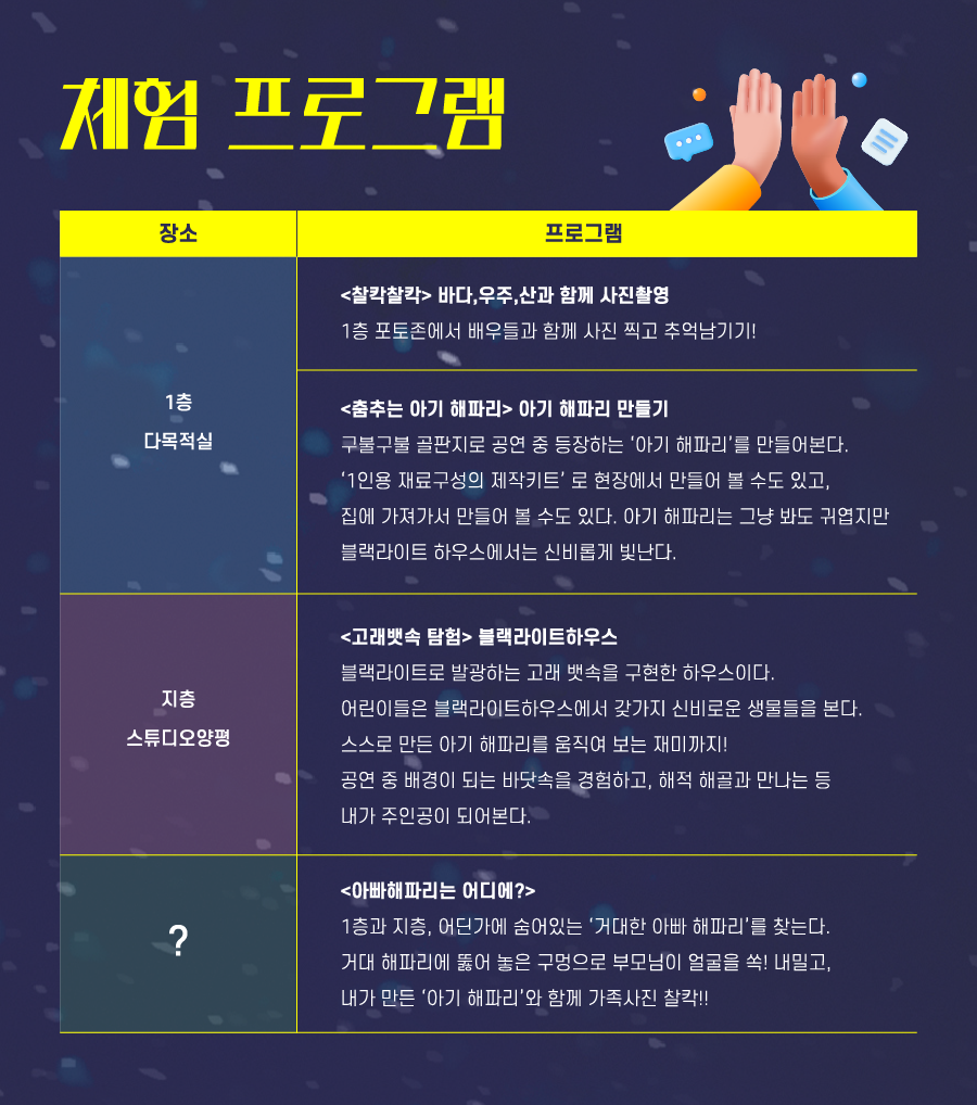 ? | 아빠 해파리는 어디에? | 1층과 지하 1층 어딘가에 숨어있는 '거대한 아빠 해파리'를 찾아보자. |