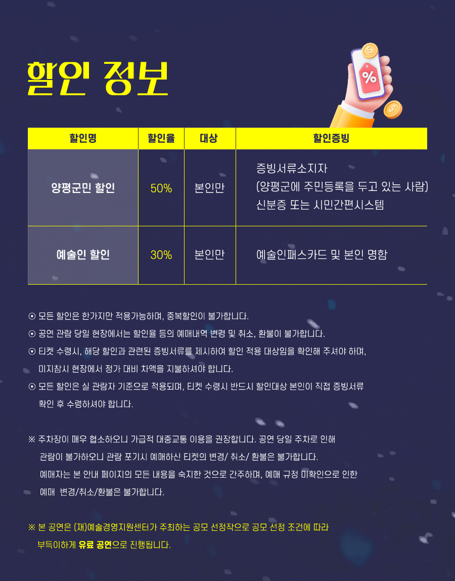 | 장소 | 양평문화재단 2층 씨어터양평 (좌석 수 총 111석) |