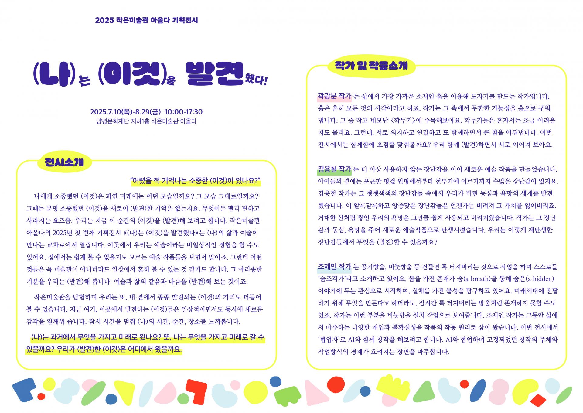 작은미술관 아올다의 2025년 첫 번째 기획전시 ≪(나)는 (이것)을 발견했다≫는 (나)의 삶과 예술이 만나는 교차로에서 열립니다.