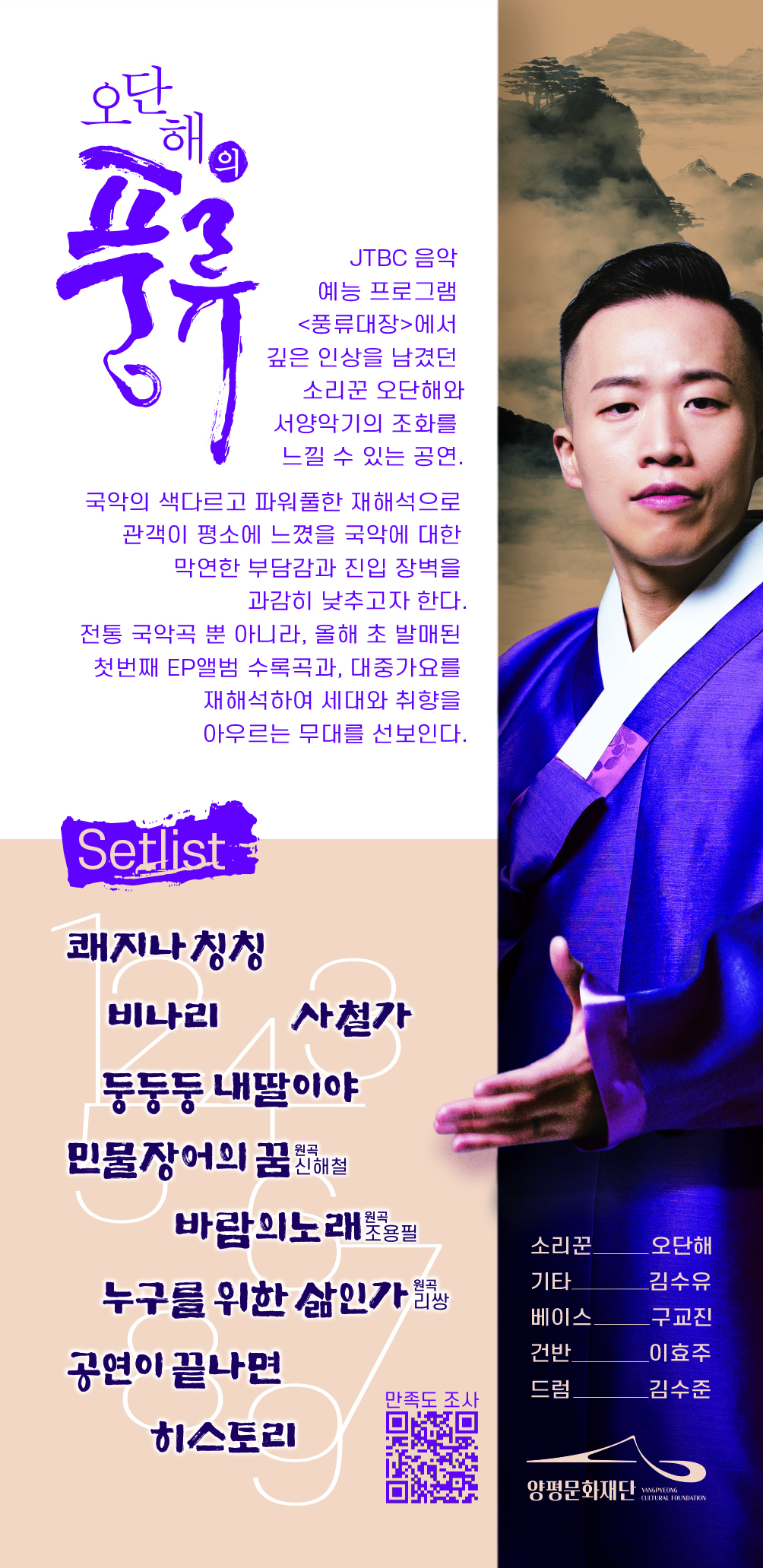 소리꾼 오단해소리꾼 오단해는 국가문화유산 판소리 심청가 이수자로 故성창순 명창을 사사하였다. 2021년 방영된JTBC ‘풍류대장’ 2라운드에서TOP10에 선정되면서 많은 주목을 받았으며, 전통음악을 보존, 계승하는 소리꾼이자, 판소리를 기반으로 창작음악, 뮤지컬, 음악극 등 다양한 장르, 뮤지션과 협업하며 활동영역을 넓혀 나가고 있는 예술가이다. |