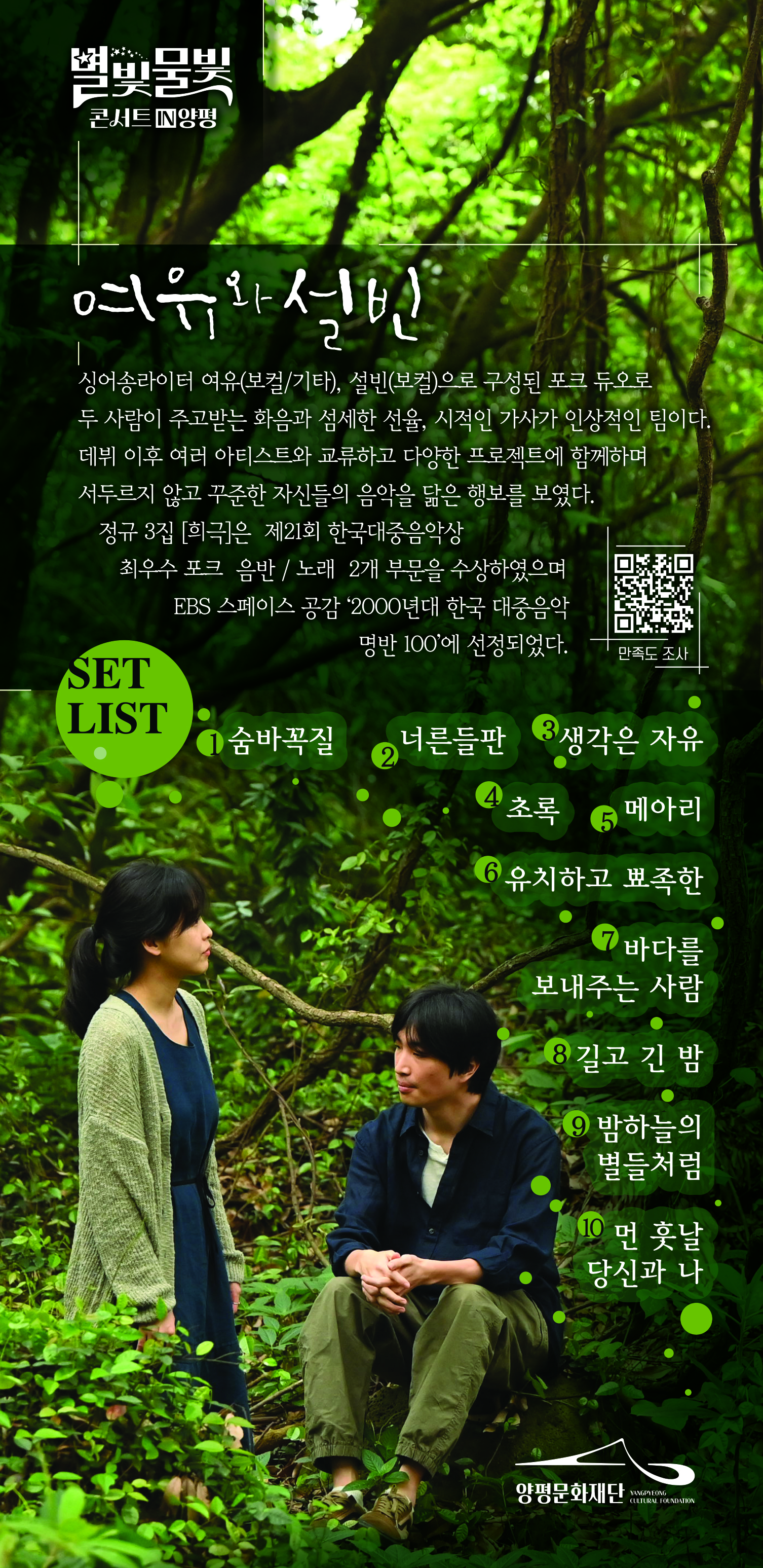 여유와 설빈싱어송라이터 여유(보컬/기타), 설빈(보컬)으로 구성된 포크 듀오로 두 사람이 주고받는 화음과 섬세한 선율, 시적인 가사가 인상적인 팀이다. 데뷔 이후 여러 아티스트와 교류하고 다양한 프로젝트에 함께하며 서두르지 않고 꾸준한 자신들의 음악을 닮은 행보를 보였다. 정규 3집 [희극]은 제21회 한국대중음악상 최우수 포크 음반/노래 2개 부문을 수상하였으며 EBS 스페이스 공감 ‘2000년대 한국 대중음악 명반 100’에 선정되었다. |